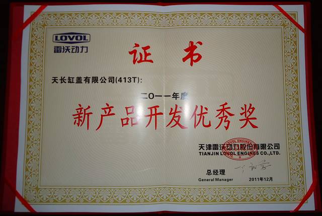 2011年12月20日,天津雷沃動力股份有限公司供應商年會在北京召開,會上,天長缸蓋有限公司榮獲“天津雷沃動力股份有限公司新產(chǎn)品開發(fā)優(yōu)秀獎”。下圖為獲獎證書。