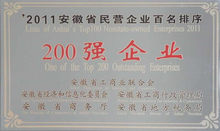 公司被認(rèn)定為“2011安徽省民營企業(yè)200強(qiáng)企業(yè)”